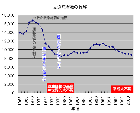 そこで、警察統計をちょっとだけ数学的に展開してみよう。 交通死者はずっと前から減り続けている |