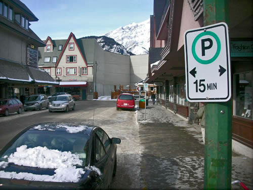 左はカナディアン・ロッキーの観光拠点 バンフの中心街だ。道の両側には、たくさんのフリー・パーキング・ゾーンが設けられている。